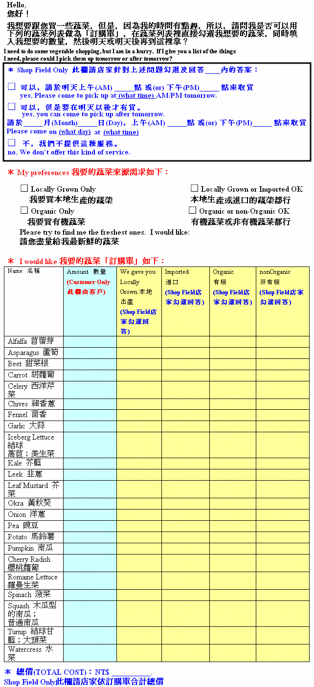 Tucking into another meal of Pringles & Coke. For the first week it was fun. All part of the topsy-turvy & hurly burly of arriving overseas. But, now - you've got your own place, or you are set up with friends and...would just like to get something a little green & a little fresh. Well, hopefully this will help. Below youll find a list of popular vegetables, their names in English & Chinese, when they are in season locally and if they are available organic. You can print the whole thing if you like (including all the spiff photos), or print the All, No Photos part or the Just Names part if you like. There's also a shopping request.