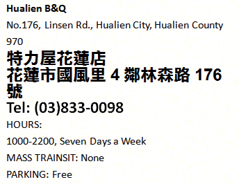 B&Q Hualien Tuh Lee Ooo -- accepts Visa, Mastercard, JCB and American Express. Refunds available within 30 days. B&Q is more of a home improvement type of place. Hualien Hualien back to list Articles Home Next Article