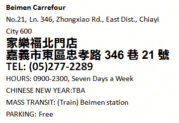 Carrefour Chiayi Ja La Foo -- accepts Visa, Mastercard and American Express. Refunds available in 7, 10 or 30 days depending on the store. Chiayi Chiayi City Beimen back to list back to list Articles Home Next Article