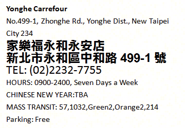 Carrefour New Taipei Ja La Foo -- accepts Visa, Mastercard and American Express. Refunds available in 7, 10 or 30 days depending on the store. New Taipei Ban Chaio Dan Shuei San Chung Shi Jr Tu Chen Chongxin Luzhou Zhongping Zhonghe Shulin Xindian Linkou Fuzhong BeiDa Yonghe Tucheng back to list back to list back to list back to list back to list back to list back to list back to list back to list back to list back to list back to list back to list back to list back to list back to list Articles Home Next Article