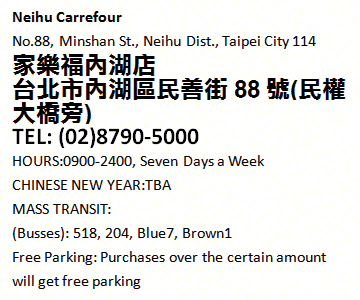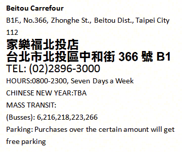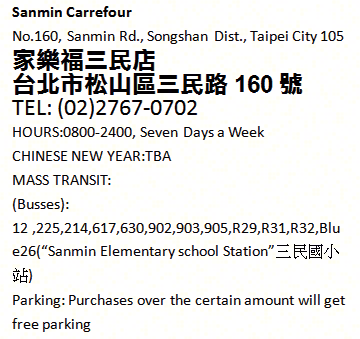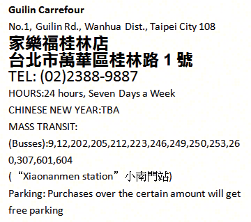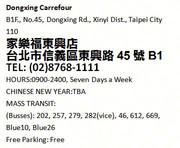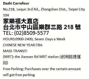Carrefour Taipei Ja La Foo -- accepts Visa, Mastercard and American Express. Refunds available in 7, 10 or 30 days depending on the store. Taipei Nan Gang Tien Mu Dongxing Neihu Dazhi Sanmin Guilin Chongqing Beitou back to list back to list back to list back to list back to list back to list back to list back to list back to list Articles Home Next Article