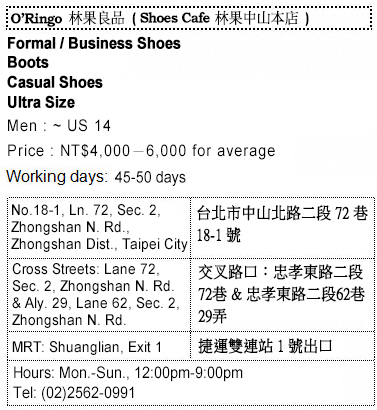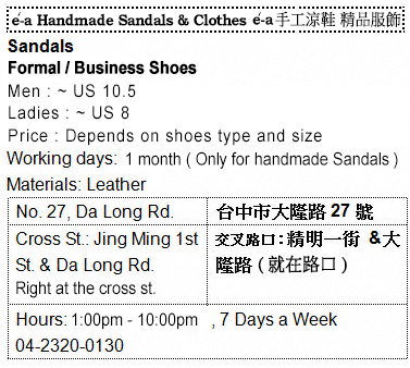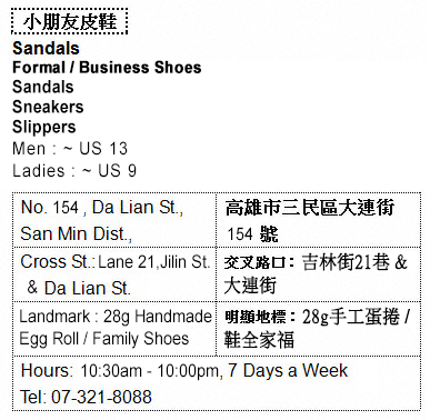 Didn't go back home last year and now that it's winter you're wrapping your feet in newspaper at home, scooting across the cold, cold ceramic tiles? Meanwhile, your local friends and small-footed compatriots are enjoying a panoply of slippers, flip-flops and even lush wingtips?! Well... fear NOT! CUSTOM made shoes are close by. Formals, too (in Taipei) and sandals everywhere. Hope this helps.
